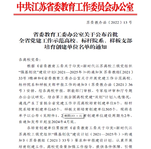 校党委先后被评为“全国先进基层党组织”“江苏省先进基层党组织”“江苏省高等学校先进基层党组织”“江苏省文明单位”“江苏省思想政治教育工作先进集体”“全国教育系统纪检监察工作先进集体”等,获批教育部“全国高校思想政治工作队伍培训研修中心”“全国创新创业典型经验高校”“全国高校实践育人创新创业基地”。自2019年省委省政府对省属高校开展综合考核以来,我校连续第三年获评该类别第一等次,高质量发展、党的建设等工作均取得好成绩。