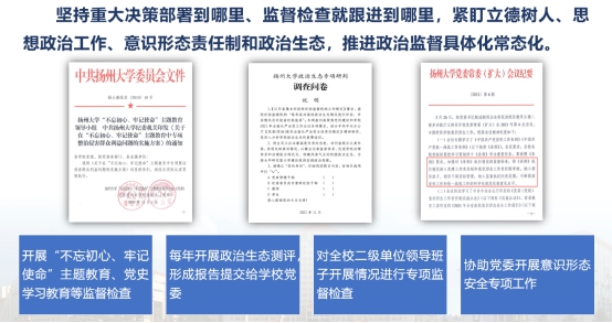 二是扎牢不能腐的笼子。对71个二级单位的1604项权力清单、3218个廉政风险点进行深入分析,持续提升廉政风险排查防控工作科学化、规范化水平。推动出台《扬州大学重点领域关键环节专责监督实施细则》、“三重一大”决策、基层党支部建设、物资采购、财务管理等领域制度60余项,推动相关部门出台《扬州大学公用房管理办法(试行)》《扬州大学小型工程管理办法(试行)》等接地气、易执行、效果好“小特精”制度130余项。